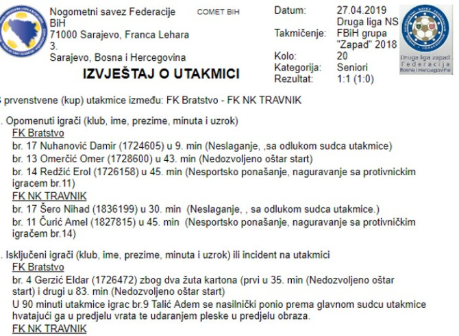 Naime, igrač domaćih Adem Talić je u 90.minuti, kod rezultata 1:1,nasrnuo na sudiju Antonija Tomića iz Kreševa, Kako piše u zapsiniku uhvatio je sudiju za vrta i udario mu plesku (verovatno šamar).