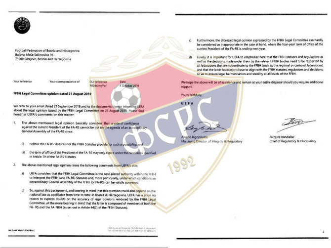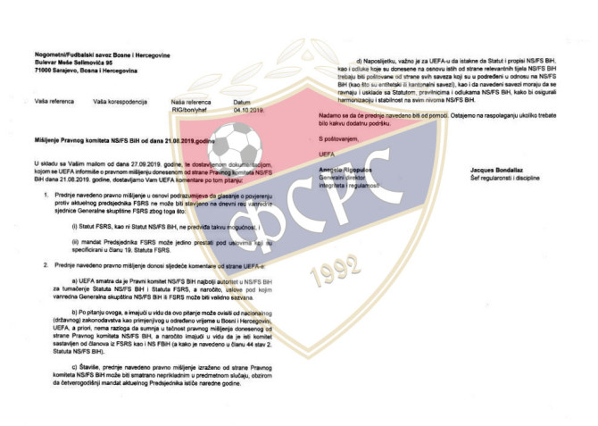 Na bazi stava dostavljenog od strane UEFA-e vidljivo je da ista poštuje statutarne principe, kao i da osigurava harmonizaciju i stabilnost na svim nivoima NS/FS BiH, odnosno FSRS kao njene članice.
