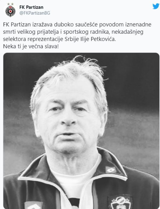 "FK Partizan izražava duboko saučešće povodom iznenadne smrti velikog prijatelja i sportskog radnika, nekadašnjeg selektora reprezentacije Srbije Ilije Petkovića. Neka ti je vječna slava", istakli su iz Partizana.