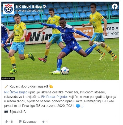NK Široki Brijeg upućuje iskrene čestitke igrači, stručnom štabu, rukovodstvu i navijačima FK Rudar-Prijedor koji će, nakon pet godina igranja u nižem rangu, sljedeće sezone ponovno igrati m:tel Premijer ligi BiH kao prvaci m:tel Prve lige RS za sezonu 2020./2021.", stoji u saopštenju Širokog Brijega.