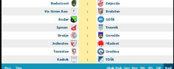 Sa našeh sajta možete, ukoliko vam trebaju uzeti i tabelu Prve lige Federacije Bosne i Hercegovine. Takmičenje počinje 13. i 14. Avgusta, a poslednje kolo prvog dijela igra se 20. i 21. novembra.