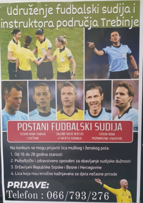 Udruženje fudbalskih sudija i instruktora suđenja iz Trebinja raspisao je konkurs za nove, mlade sudije. Mogu se javiti i djevojke i mladići od 16 do 28 godina starosti.