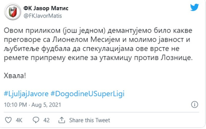 Ono što je sigurno u ovom trenutku je da Mesi neće u Javor. Klub iz Ivanjice se na svom zvaničnom Tviter nalogu oglasio i saopštio da ne pregovaraju sa Mesijem.