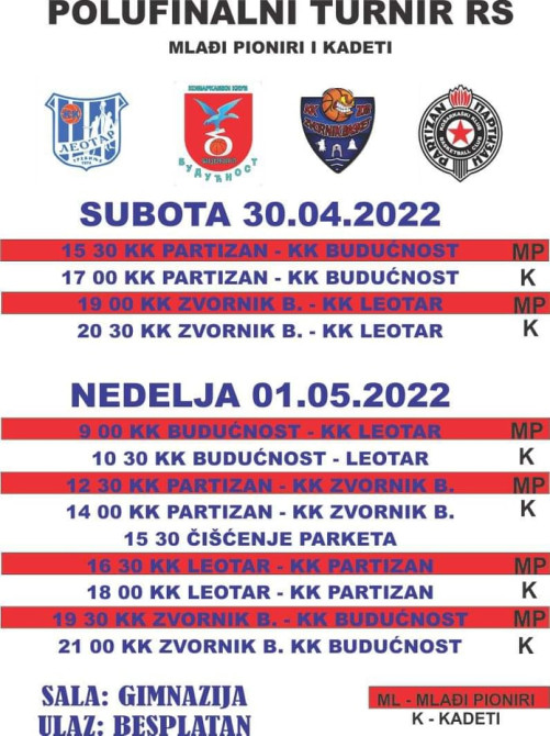 Polufinalni turniri za obje kategorije na programu su u tokom vikenda 30. april i 1. maj u Bijeljini.