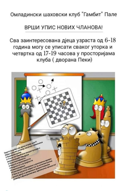 Paljanski Omladinski šahovski klub "Gambit" jedan od najboljih klubova u Republici Srpskoj u konkurenciji mlađih kategorija vrši upis novih članova.
