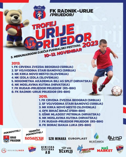 Fudbalski klub Radnik Urije organizovaće od 10. do 12. novembra ove godine peti međunarodni dkečiji fudbalski festival “Trofej Urije Prijedor” na kojem će nastupiti 11 klubova u dvije kategorije, dječaci rođeni 2013. i 2015. godine. Nastupiće više stotina dječaka i djevojčica, a za najbolje ekipe obezbjeđenje su nagrade, pehari, diplome i medalje.
