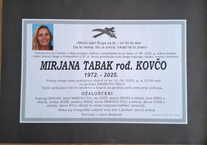 U Gospiću je, u 53. godini života, nakon duge i teške bolesti preminula Mirjana Tabak Kovčo. Nekadašnja košarkašica Mladog Krajiška tokom devete decenije prošlog vijeka rođena je 1972. godine u Duvnu (današnji Tomislavgrad).