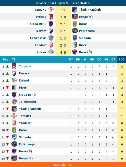 Najuvjerljiviju pobjedu u prvom kolu upisala je ekipa Torpeda, koja je goste iz Maglajana ispratila sa sedam golova u mreži. Dva manje je dala Kozara, dok je ekipa Kalema sa 4:0 bila bolja od Borca iz Šibovske.