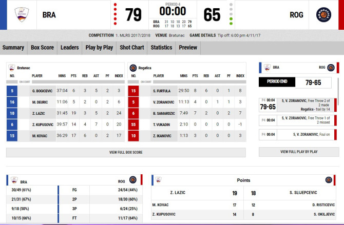 Košarkaši Bratunca u svojoj dvorani bili su bolji od Rogatice. Zabilježili su pobjedu od 79:65. Po četvrtinama je bilo 31:17, 10:18, 18:13 i 20:17. Pitanje pobjednika bilo je praktično rješeno već u prvoj četvrtini. Domaći su odigrali odli čno i poveli sa 31:17.