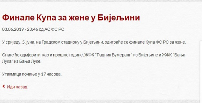 Nakon našeg teksta o meču Borac Banjaluka – Rudar Prijedor, o kojem na sajtu FS RS neće pronaći gotovo ništa, javili su nam se ljubitelji ženskog fudbala i ukazali na činjenicu da na sajtu FS RS nema rezultata polufinalnih utakmica Kupa Republike Srpske za žene, a nema ni podatka o finalnom okršaju. Tačnije, na prvoj strani sajta ima najava, štura i to je sve.
