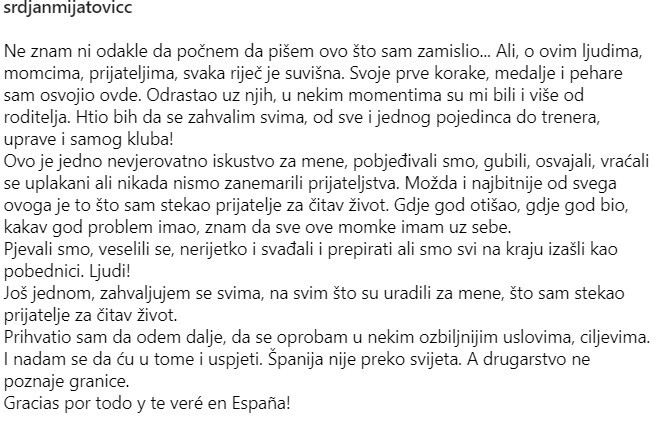21-godišnji bek, koji je za seniorski tim Borca debitovao u oktobru 2015. godine, emotivnom porukom, objavljenom na Instagramu, oprostio se od matičnog kluba.