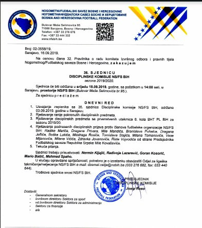 Poziv za sednicu Disciplinske komisije FS BiH