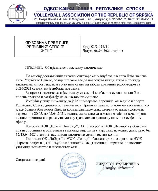 Dopis Odbojkaškog saveza Republike Srpske vam donosimo u fotografiji ispod.