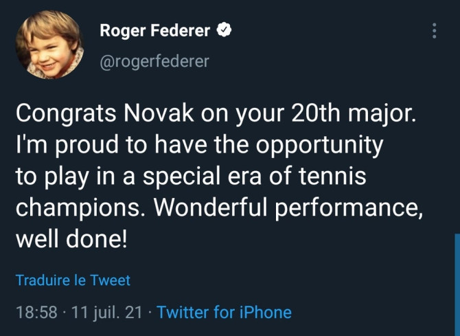 "Čestitam Novače na tvom 20 Grand Slamu. Ponosan sam što imam priliku igrati u ovoj posebnoj teniskoj eri. Vrhunska predstava, bravo!", poručio je Federer.