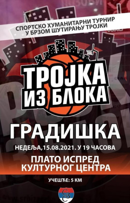 Humanitarni turnir u brzom šutiranju trojki održaće se u nedjelju 15. Avgusta na platou ispred Kulturnog centra Gradiška sa početkom u 19 časova.