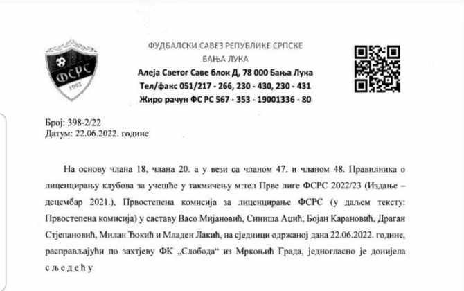 MRKONJIĆ GRAD - Fudbalski klub Sloboda iz Mrkonji Grada, dobio je licencu za nastup u Prvoj lige Republike Srpske. Naime, Komisija za licenciranje klubova Fudbalskog saveza Republike Srpske, na sjednici održanoj 22. juna donijela je odluku o dodjeli licence Fudbalskom klubu Sloboda iz Mrkonjić Grada, za takmičenje u Prvoj ligi Republike Srpske, u sezoni 2022/23.godina.