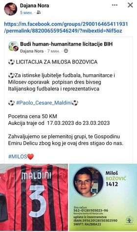 U Fejsbuk grupi Budi human – humanitarne licitacije u BiH u toku je licitacija za dres Paola Mladinija, a novac od licitacije idu za liječenje našeg Miloša Božovića.