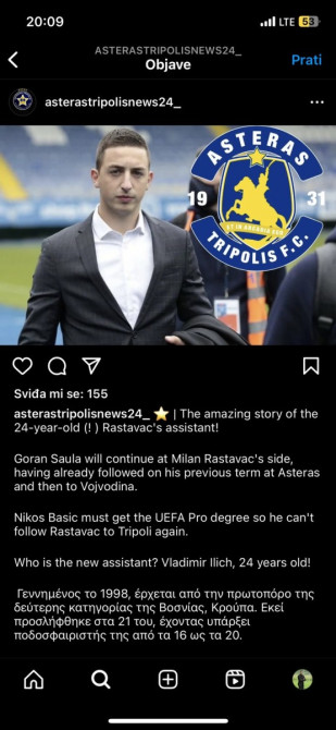 Vladimir Ilić (24), zvanično najbolji trener Republike Srpske u posljednje dvije godine biće pomoćnik Milanu Rastavcu na klupi grčkog prvoligaša Asterasa iz Tripolisa, kluba koji je doživio meteorski uspon u posljednje dvije decenije u fudbalu “zemlje Helena”.