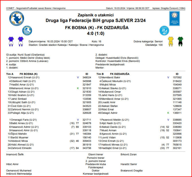 Bosna je ovu utakmicu dobila sa 4:0, ali treba podvući i da je Dizdaruša u startnoj postavi imala četvoricu igrača ispod 21. godine, a u zapisniku od njih 20 bilo je 11 igrača mlađih od 21. godine.