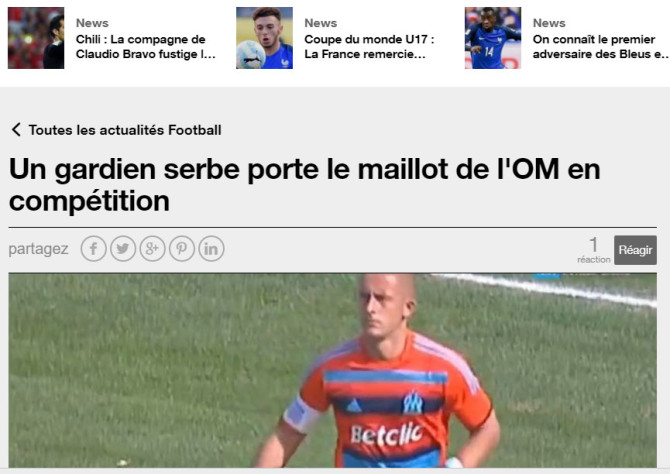 Golman Rtnja Vladimir Milošević našao se na stranicama francuskih portala posle utakmice sa Partizanom.