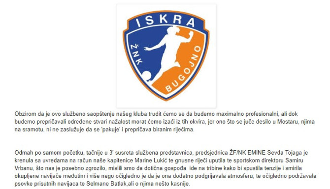 ˝Incident koji se desio nakon utakmice, kada su službena lica i igračice ŽNK ,,Iskra“ krenuli da napuštaju stadion izazvali su svojim neprimjerenim i neodgovornim ponašanjem navijači gostujuće ekipe koji su došli iz Sarajeva.˝