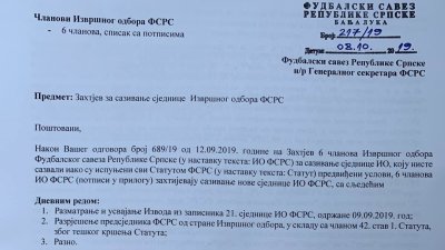 Novi dopis nam je stigao od članova Izvršnog odbora FSRS. Oni su danas u administraciji saveza predali zahtjev za vanrednom sjednicom Izvršnog odbora. U potpisu je šest članova IO koji traže hitnu sjednicu i razrješenje predsednika FSRS. Evo šta su napisali u svom dopisu FSRS: Predmet: Zahtjev za sazivanje sjednice Izvršnog odbora FSRS Gospodine predsjedniče, Nakon Vašeg...
